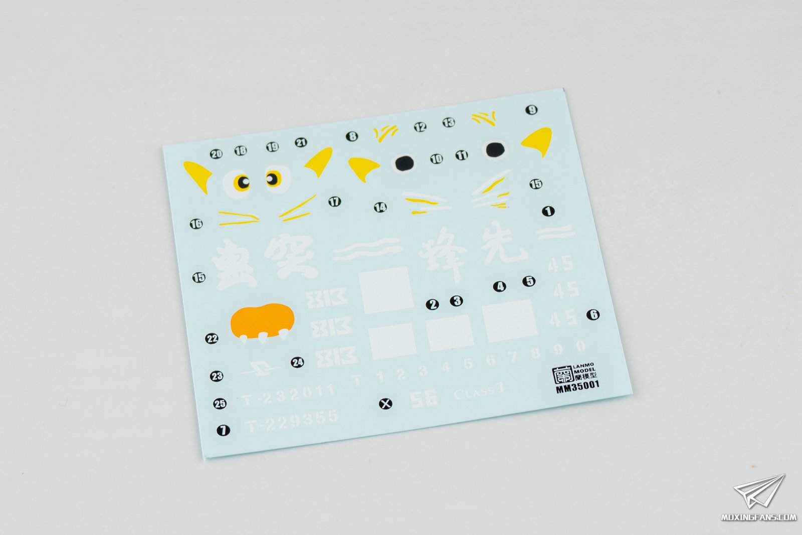 ▼ 水贴提供了大家熟知的突击号和先锋号水贴,虎头图案也用水贴表现。蚀刻片提供了潜望镜护弓,侧裙挂架,绑带和尾部排气装置。打印件则主要是机枪,火炮行军锁,驾驶员雨挡,大灯灯架和煤油灯等零件。