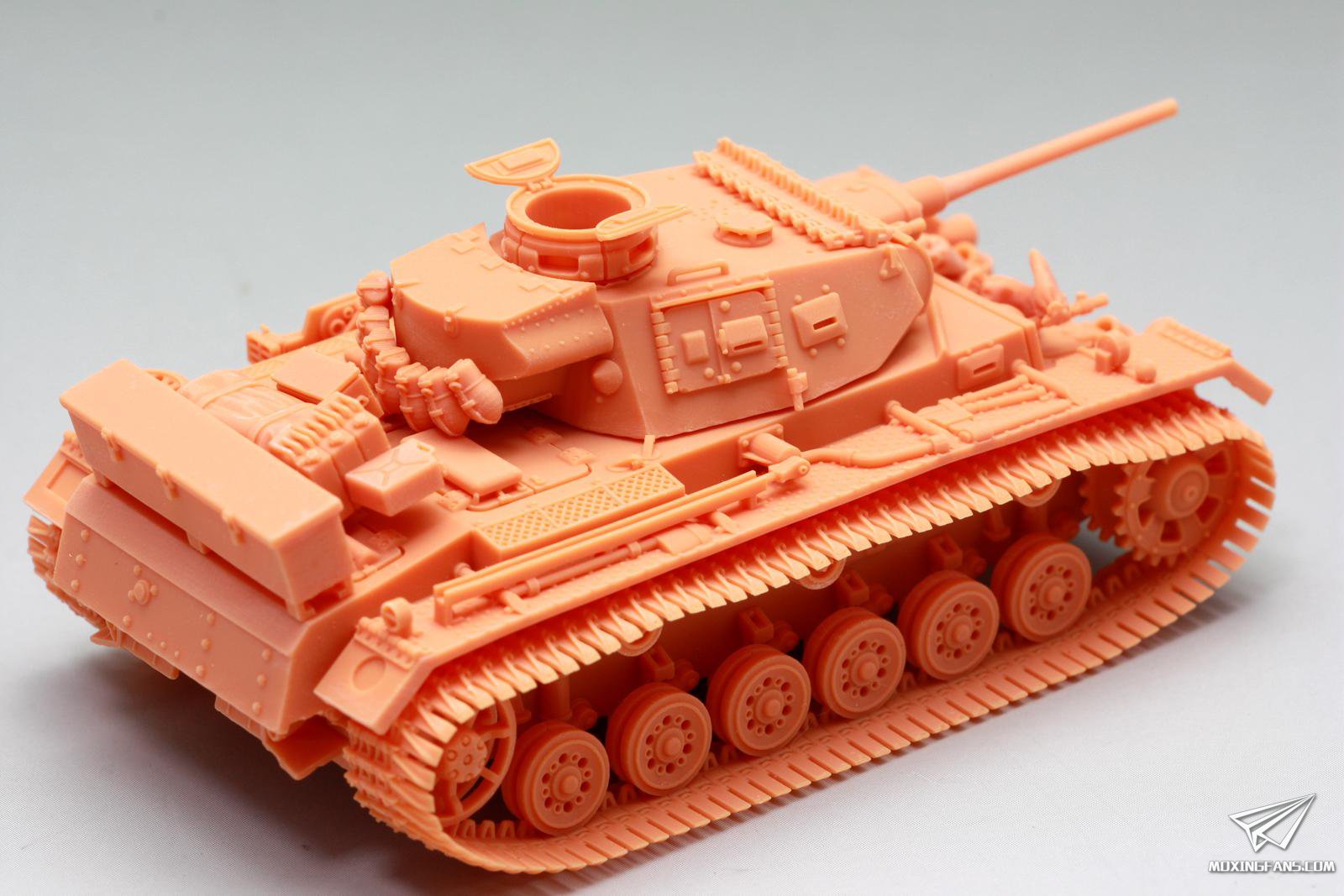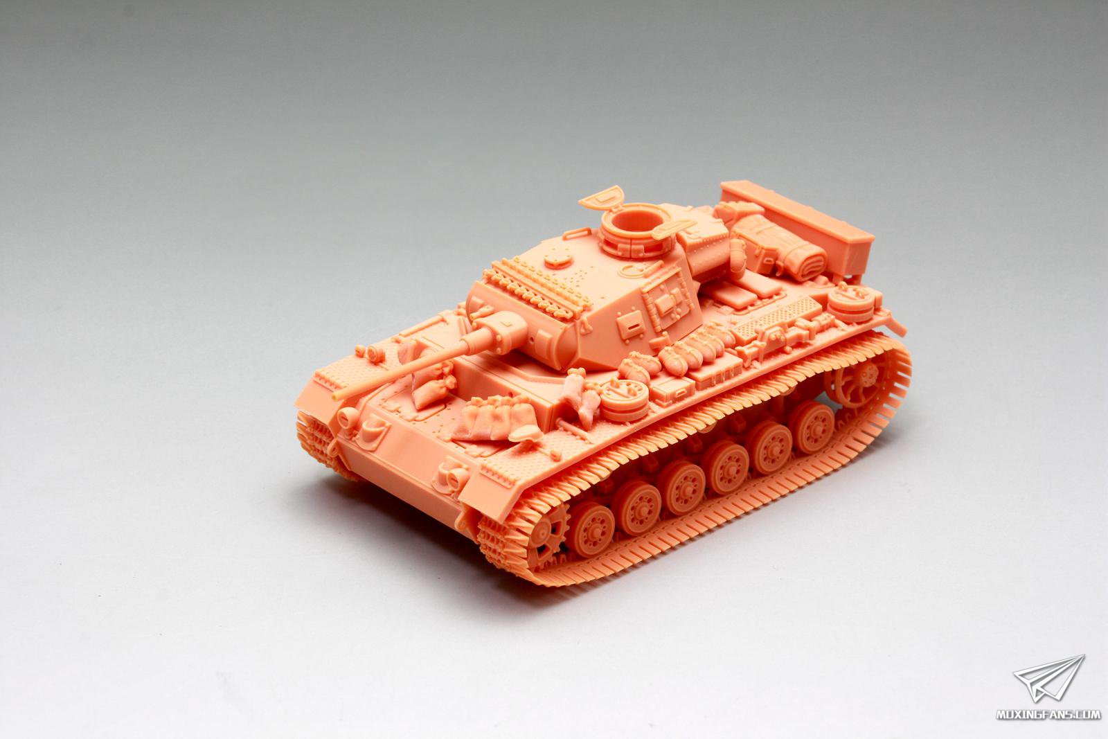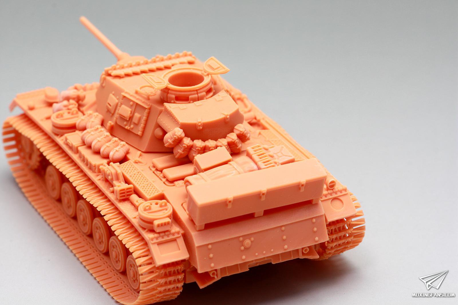 总结如下: 组合度(满分5分,越高越好):5分。 蛋壳模型这盒3D打印套件在组合度上好得一批。 细节表现(满分5分,越高越好):4.0分。 该套件在细节上充分发扬了3D打印的各种优势,犀利的螺栓细节,镂空诱导齿,精致的工具细节,镂空散热网,细腻的防滑齿,所有这些细节都在这辆小巧的三号J上得到了很具体的表现;非要说不足的话,笔者感觉,部分细节的比例尺寸要大了一圈出来,我愿意称之为细节放大版三号,比如航向机枪,又长又粗,笔者制作过的黄蜂72比例航向机枪可没有那么粗;比如水壶,换算到现实也许能装4L水或茶,又比如前灯,总之感觉大了一圈,这样做也许考证党要吐槽,但是从素组完成的表现力来看,有些许漫画和现实相结合的既视感,细节表现得到了增强放大,增强了视觉冲击力。 制作难度(满分5分,越高越难):1.5分。 作为3D打印大模块集成化安装的套件,制作难度就忽略不计了,1.5分主要来自于拆除支撑的过程,模型材质有一定韧性,特别是履带部分,韧性十足,车体和炮塔部分硬度还是可以的,拆除支撑时直接徒手掰下来即可;履带和车载物资工具这一块需要耐心轻力一点,该用剪钳的时候不要犹豫,打印支撑的断点几乎都是在看不到的背面,拆除以后可以笔刀切除多余部分,打磨平整不见孔即可。 IN A WORD,这是一套性价比高,细节不错,制作简单,值得小比例党入手的套件。