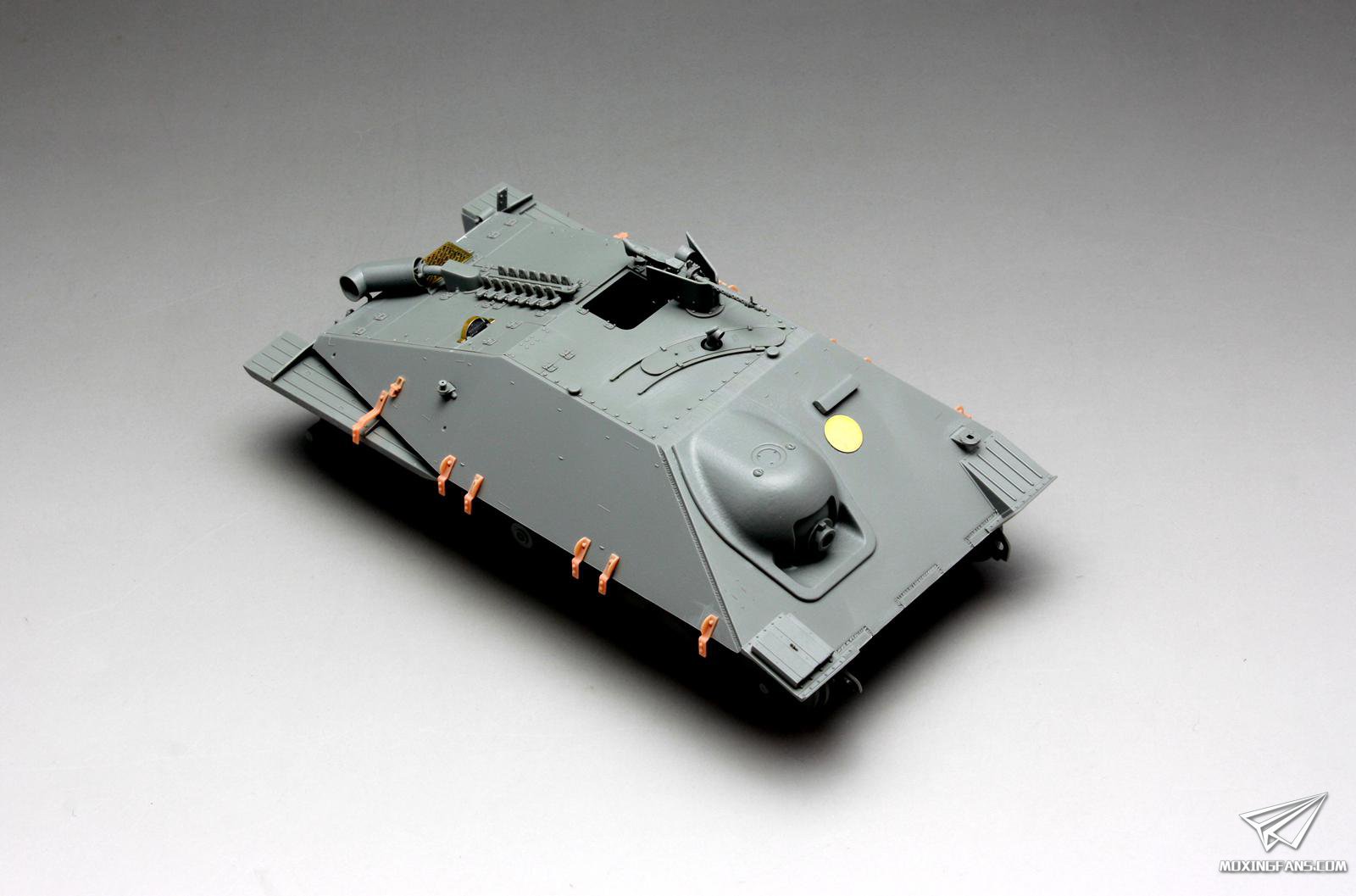 到车体这一步就可以选择制作了,根据涂装和炮盾的不同,套件提供了五款形态,小编选择制作了木板放盾的形态,这个形态的主要特征是炮盾处钉了块木板,MG34机枪代替了主炮。笔者截短了主炮接口,以便安装机枪,当然也可以把主炮安装上去还原原来的追猎者。