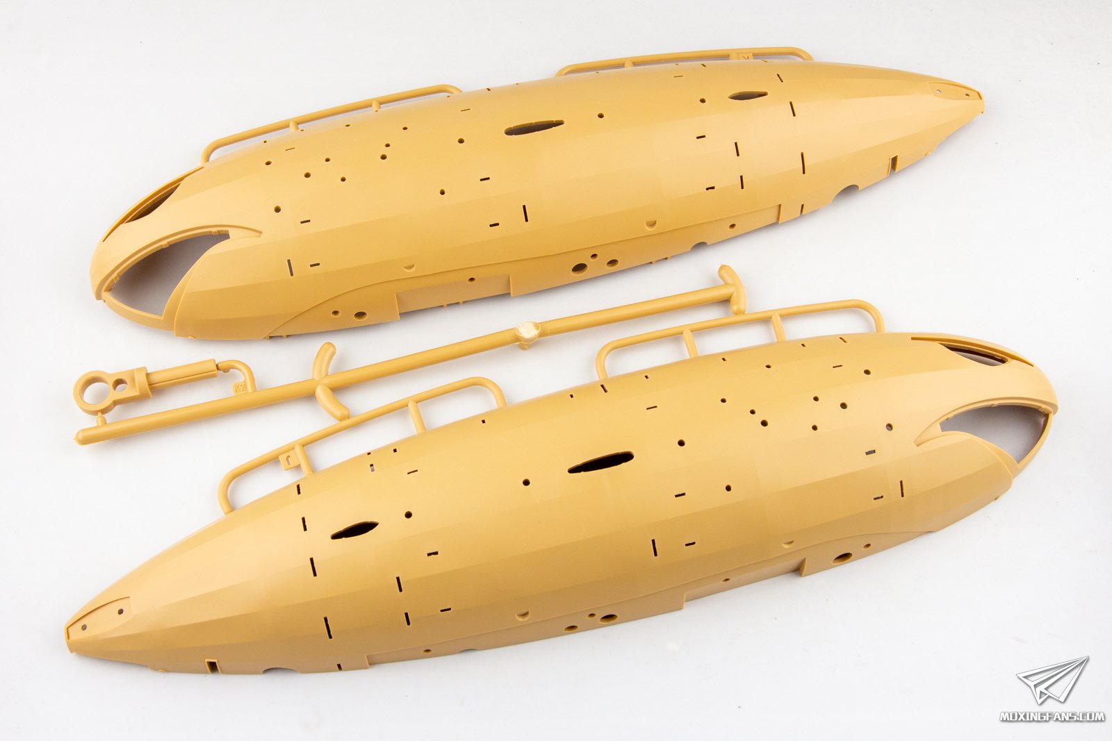 在边境模型的产品序列里,红警系列属于非常一类非常特殊的题材,在推出了天启和灰熊等红警题材之后,边境模型在前不久推出了这款人气更高的基洛夫飞艇套件。跟之前的套件一样,这款基洛夫也采用了免胶分色设计,附带灯光和电动套件,完成后螺旋桨可转动,吊舱内的灯光可以亮起,可玩性非常不错。 ▼ 因为是游戏里的架空题材,所以这盒套件并没有标注比例,整个艇身长度超过35厘米。板件数量相对于一般的免胶分色产品要多一些,板件分为黑色,红色,橙色和灰色共4种颜色,附带透明件和电动和灯光组件。
