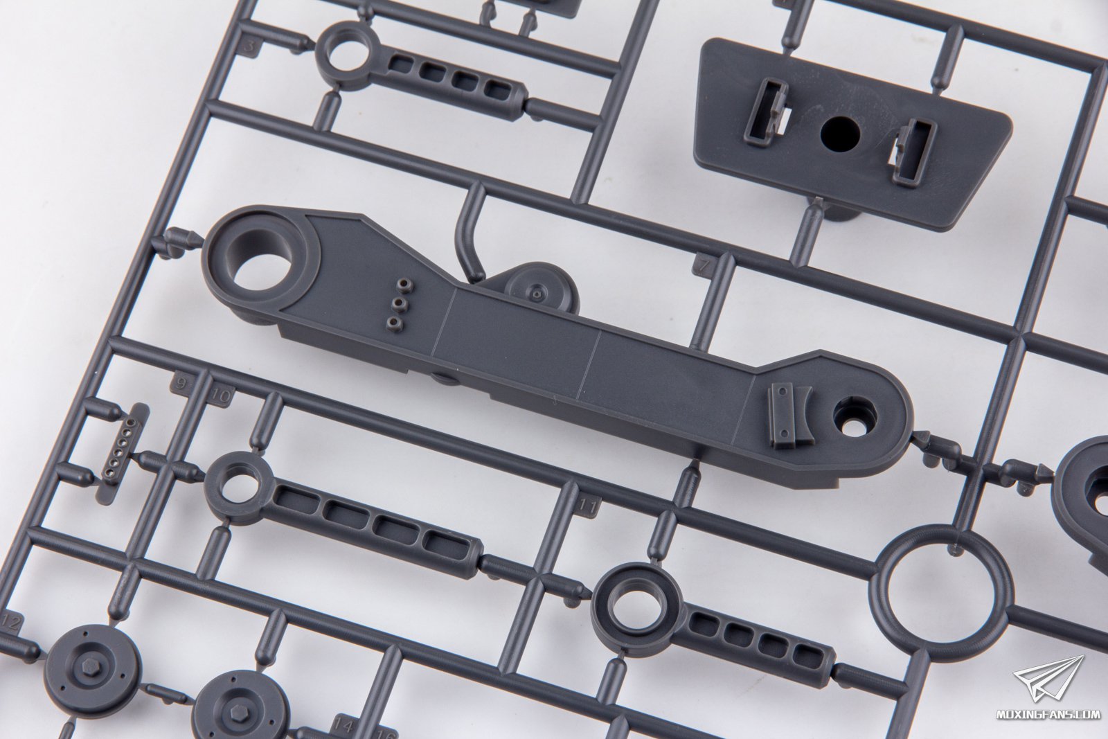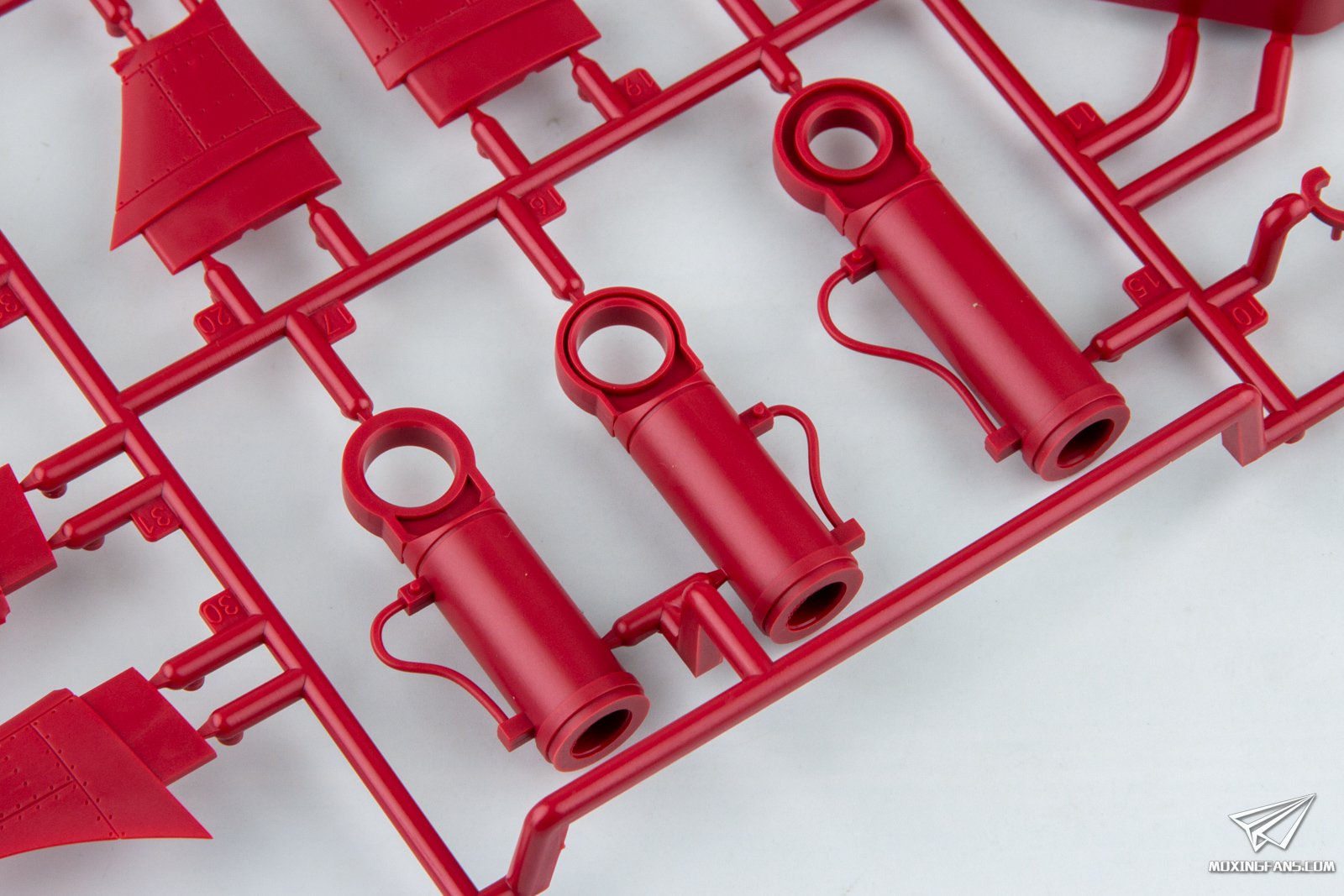 ▼ 支架的液压撑杆采用了滑块开模的方式,管线细节一并开出。艇身的短翼开出了不少凹钉细节,艇身尾部的红色加强装置表面有轻微的缩胶情况。