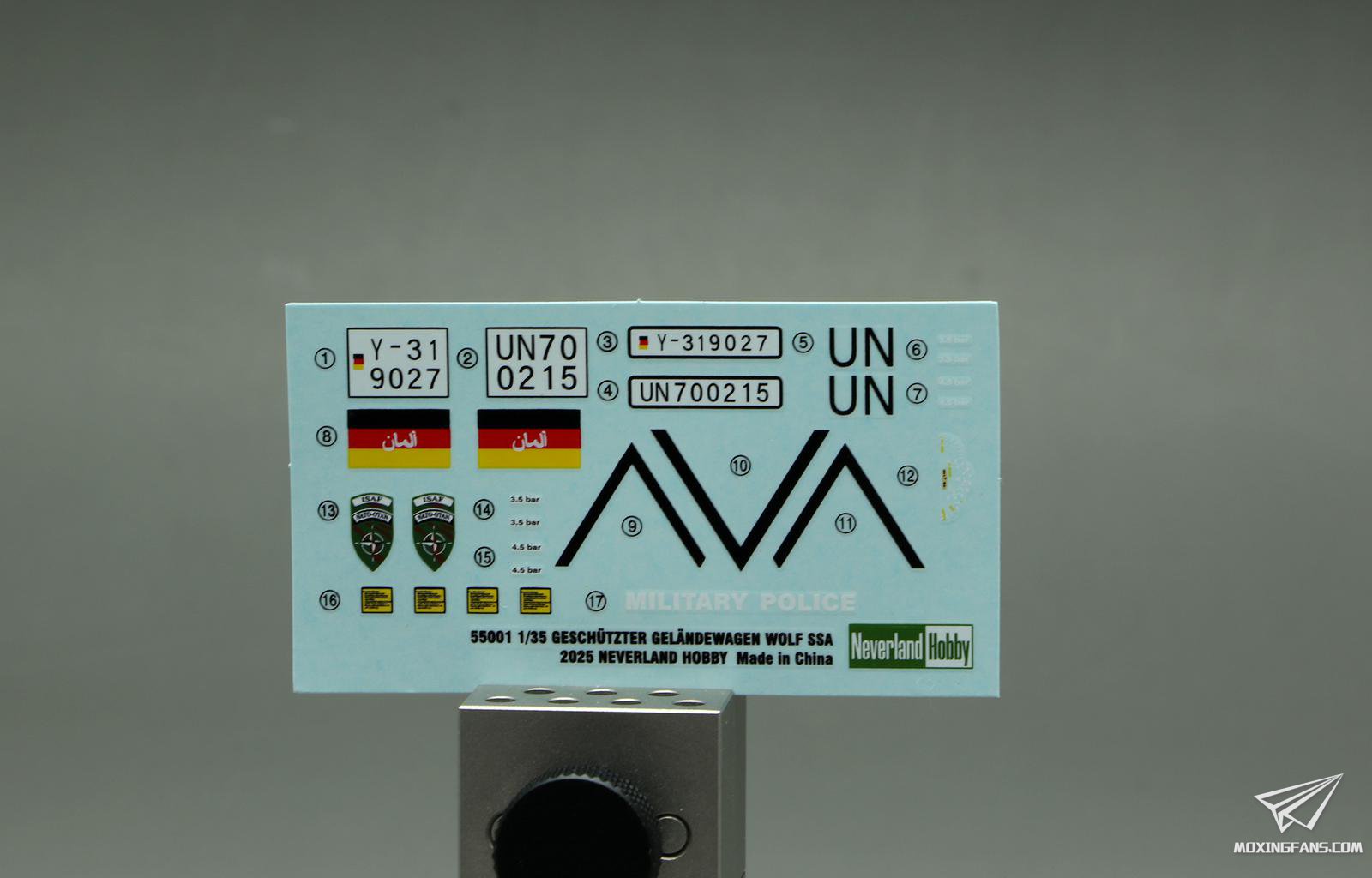 水贴一张,提供了三种时间地点截然不同涂装方案;他们分别是驻扎在汉诺威的联邦国防军宪兵部队,他们使用经典的北约三色迷彩涂装,而宪兵装备则很少出现在模型套件中;“持久自由”行动中驻喀布尔的国际安全部队,使用者可能是神秘的KSK特种部队,因为该车有时会执行要人保护任务;最后是驻在加奥(Gao)的联合国马里稳定团,这是联合国作战环境最险恶的维和部队,联邦国防军曾在这里与解放军以及其他维和部队一起,并肩用鲜血尽力维护着当地秩序。