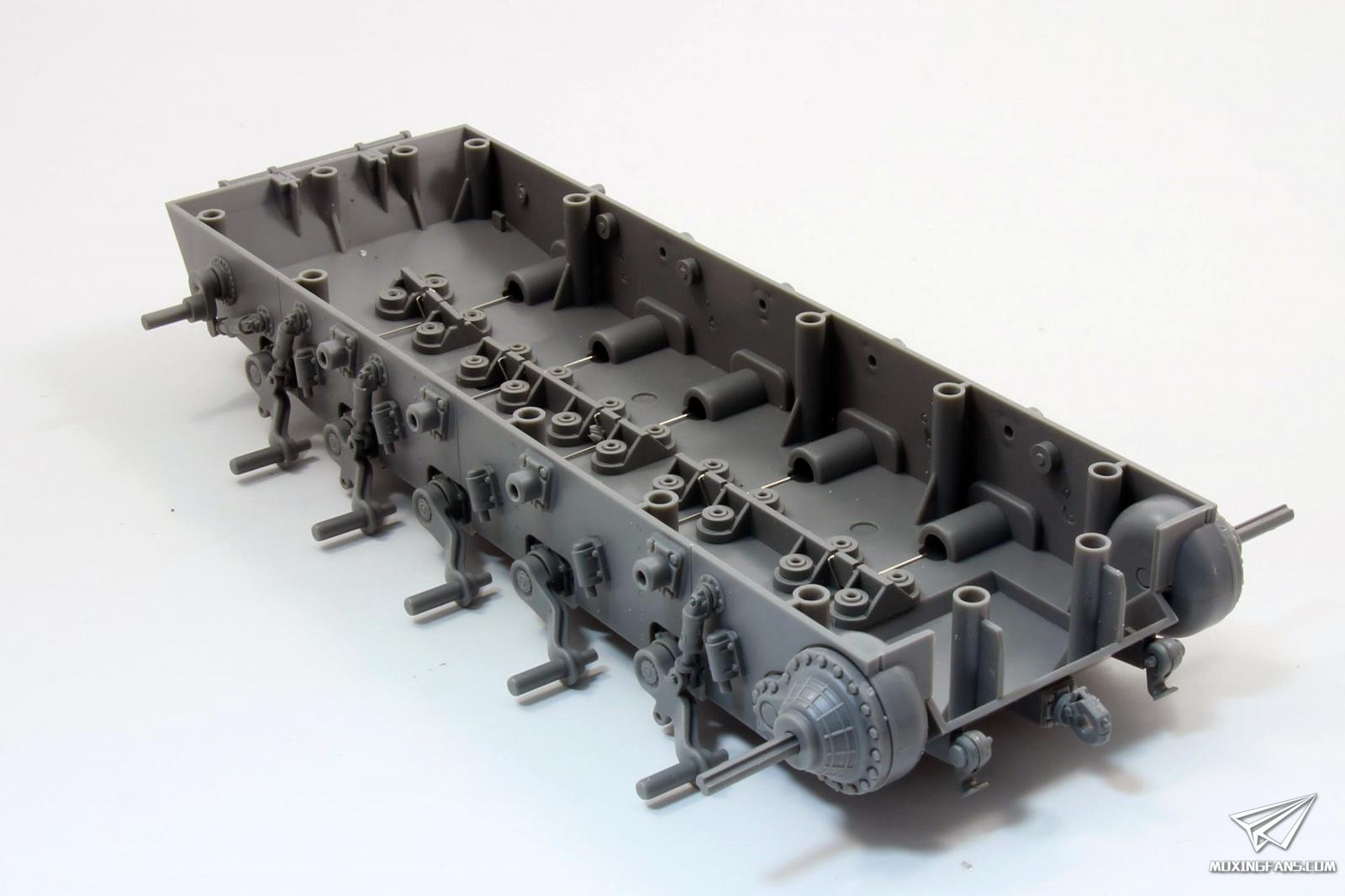 底盘部分,套件给出了金属钢丝当作扭力杆,切掉路轮悬臂定位点后可以实现活动悬挂,这里推荐保留前后两组定位点,以免出现全趴现象。