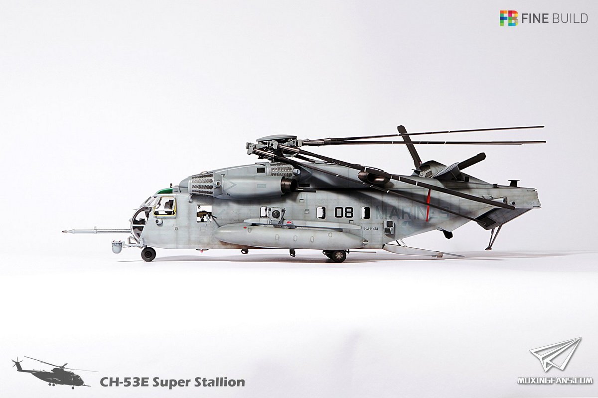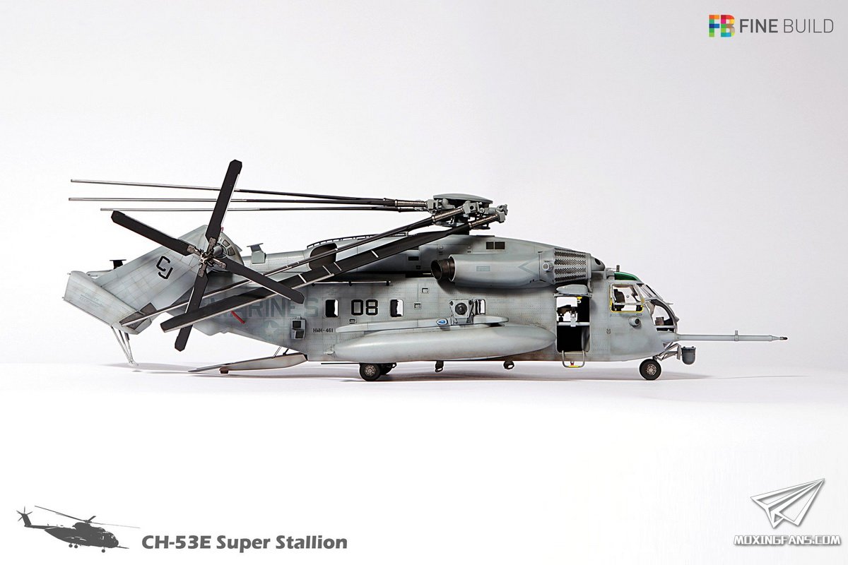 Hwang Sunhwie大师的这件作品使用的是爱德美推出的1/48比例的CH-53E海种马直升机,选择了占地更少的折叠机翼的状态来制作,相对于伸展状态的细节更多。目测作者还在机身上打了不少钉子,使用了Wolfpack的补品提升了细节。涂装方面则是以美海军标准色为主,旧化小清新,看上去清爽的同时又不乏细节,作者对旧化的把握很到位。