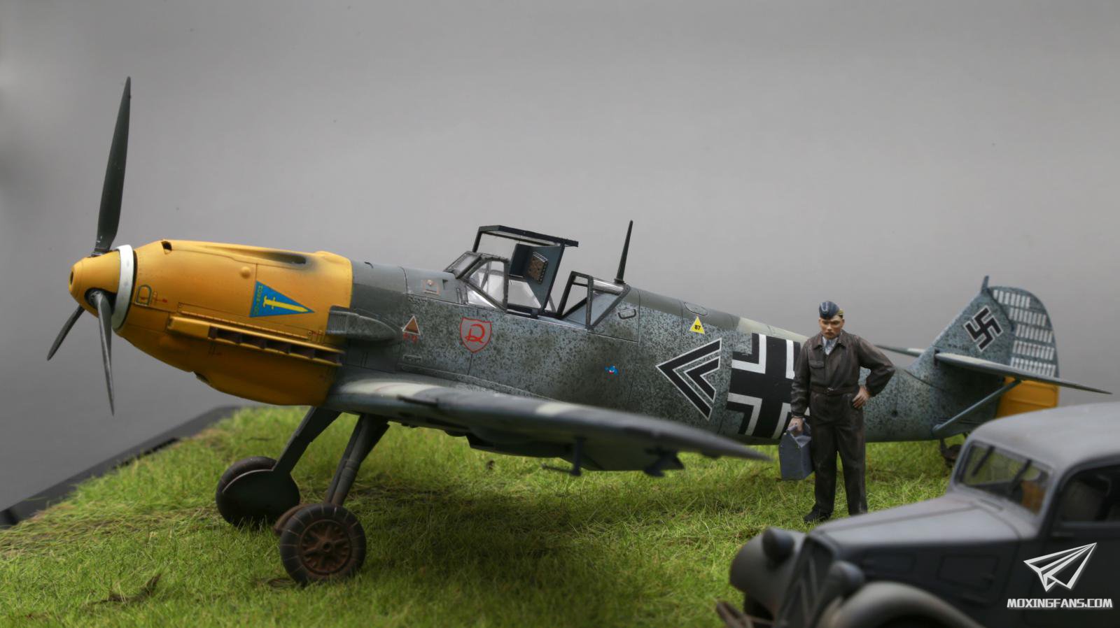 BF109是二战德国产量最高的机型,其覆盖战线之广、成就王牌飞行员之多称为空前绝后豪不夸张。在熠熠生辉的众多王牌中,赫尔默特.维克少校可能并不为人所熟知,因为在整个漫长的二战历史中,他如昙花般绽放后便迅速陨落,最终战绩为56架(1940.11月不列颠空战失踪)。战果虽与后来的德国空军头号王牌相去甚远,但笔者认为此君有三个方面令人印象深刻,一是战绩中包含了16架喷火和14架飓风,这在当时以惨烈和高格斗技术著称的不列颠空战中非常难得;二是其本人在德国空军中的职务,1940年10月19日,维克晋升为JG2联队长,少校头衔,时年才25岁,堪称德国空军史上最年轻联队长,而仅仅在两个月之前,他还仅仅还在指挥着一个四机小队,足见当时德国空军对其看重提拔之心;至于第三点,就是本文的主角,维克少校的座机——BF109E-4,笔者做过多款109,但此款是唯一一款让笔者一直保持很高制作欲望的涂装——同一涂装已经做过4个了。个人觉得看点有三,一是英伦空战德国典型的墨绿-浅卡其机翼涂装;二是里希特霍芬连队的R标志、第三中队的HORRIDO“恐怖之剑“三角标志以及维克“飞翔的小鸟”的个人标志,非常彰显个性;第三就是它机身类似于剥落状的迷彩(到底是迷彩还是剥落犹未可知),仿佛一幅斑驳的老胶片,将回忆带回到那个疯狂的年代。制作过程很流畅,熟能生巧了,基本直做,增加了安全带,改加电机,这里分享一下机身迷彩的制作:牙刷飞溅+喷涂,先码两张维克本人及其座机的照片: