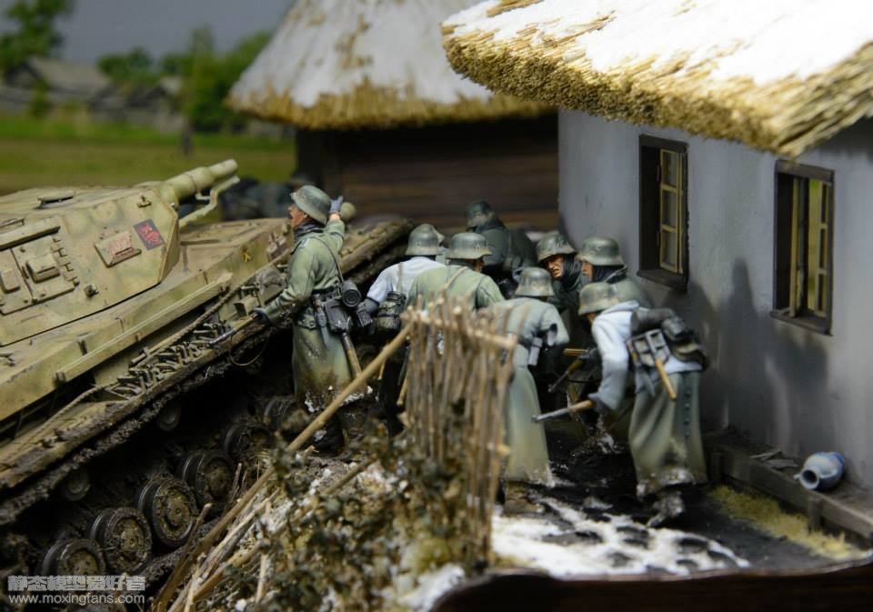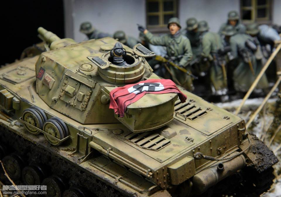 大师的这件作品定位实在1941年的东线战场,一小队德军即将发起进攻,却被对面敌人的火力压制,正巧有一辆四号坦克经过,士兵们随即向其求助大喊:“我们就等你了!”。四号坦克使用的是威龙的板件,使用暗黄色的涂装,储物箱上的万字旗很是显眼,处理的效果非常好。兵人画的非常精细,不论是动作还是神态都非常自然,衣服上的泥渍和残雪都能让人感受到冬季刺骨的寒冷。真个雪景表现的非常和谐,仿佛像是历史照片那样的自然,上色和旧化虽然没有绚丽的技法,但是细节非常独到,处处都能体会到日本模型大师的匠心独具。