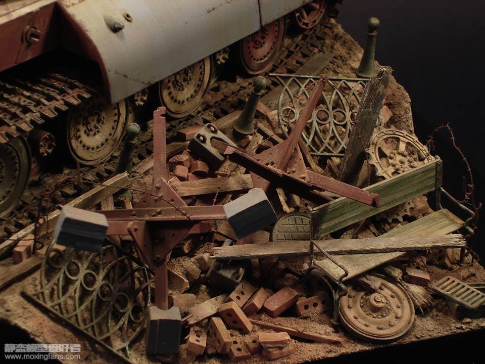 E-100重型坦克毫无疑问是WOT中的明星坦克,强大的火力,不错的防御,将德系坦克的优势发挥到了极致。José Brito大师的这件E-100场景使用的是小号手的板件,为了制作游戏中的型号,放弃了原有的炮塔而采用了树脂炮塔,没有将火炮换掉有些遗憾,并非完全体。涂装方面采用了防锈红的工厂涂装,细节处理的也非常到位,侧裙使用了德国灰涂装,形成鲜明对比。场景使用了大量杂物来做衬托,相信大师手中一定有不少烂尾。