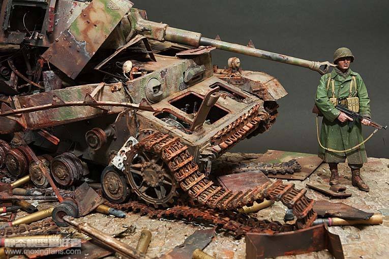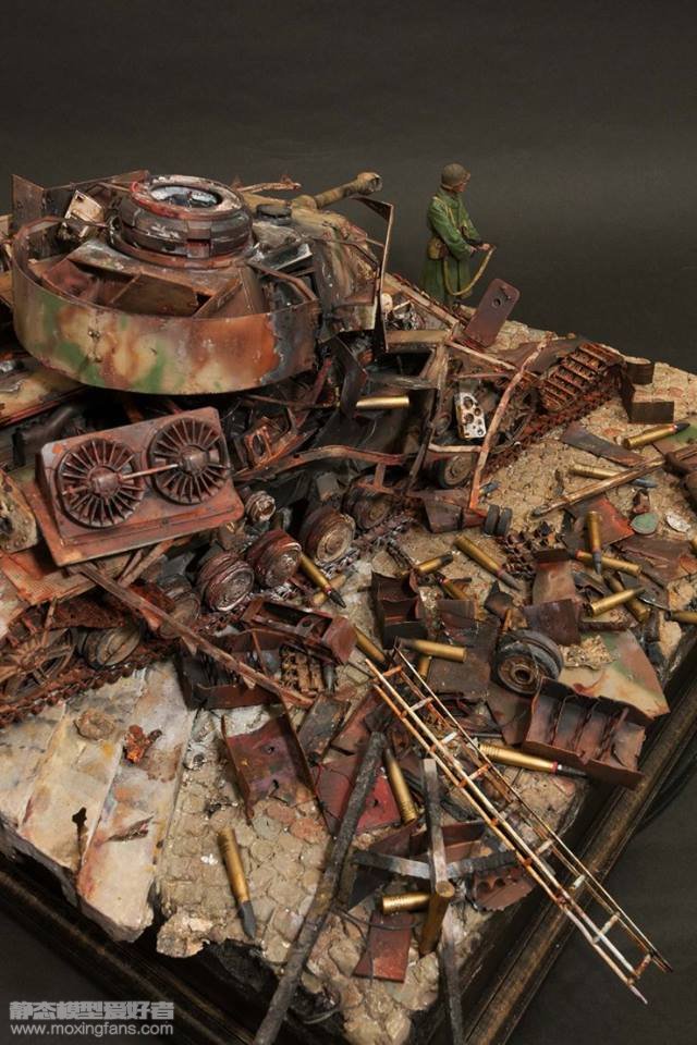小号手16比例的四号坦克上市也有不短时间了,但是成品却很少。Shigeyuki mizuno大师的这件作品使用的就是小号手的全内购四号坦克,进行了部分改造, 并且制作了全车防磁装甲,为了展现其内购和丰富的细节,所以制作成为了被击毁的状态,大大的秀了一把烧蚀效果,最终的成品让人赞叹。不得不说,大比例的细节就是好,但是将四号坦克做成这个状态实在让人有些心疼。。。照片比较乱,请谅解。