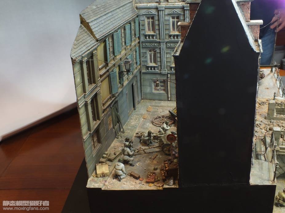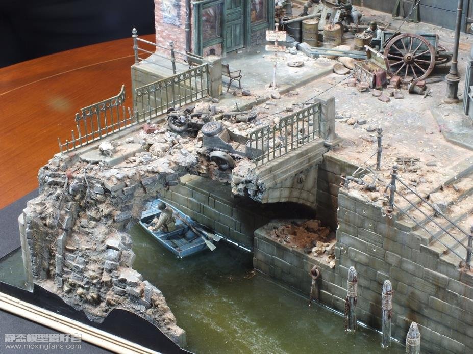 这件模型场景是Diego Cuenca大师的又一大作,主题为1945年的柏林。情节设定比较巧妙,一小队德军士兵依托地形使用PAK38反坦克炮顽强的抵抗,另一面的苏军JS-2却因为地形的阻隔无法攻击,2名苏军士兵使用小舟渡河来到桥下准备突袭。整个场景十分宏大,设计的十分合理,不管是装备还是兵人都十分生动,建筑物的细节也是一丝不苟,神作! 小编有一点点疑问,德军是1945年5月投降的,而场景中的士兵们还穿着冬装是否不妥,将时间设定在1944是否更合适?