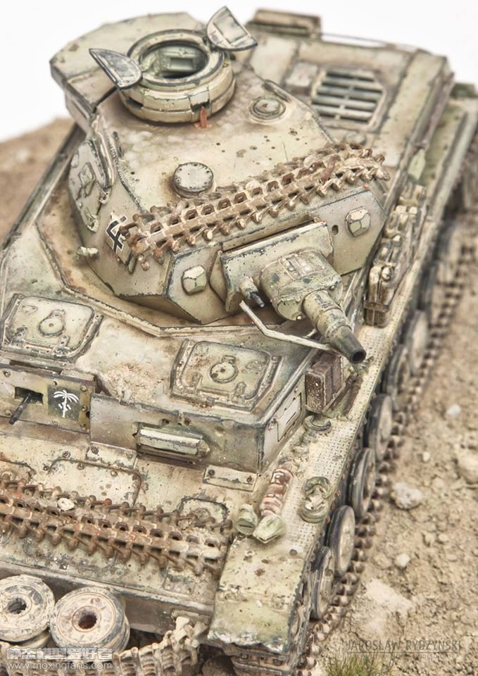 Jarek Rydzyński大师给我们带来的这件作品使用的是威龙的四号坦克,以直做为主。涂装选用了德国北非军团(DAK)的涂装,制作了比较重的褪色效果,在暗黄色面漆的下面隐约露出了德国灰的底色。因为北非干燥的环境,天然土方面也使用浮沉作为主要效果。简单的一个小地台,表现出北非那种干旱的自然环境,路轮也根据高低不平的地台制作出了起伏的效果。
