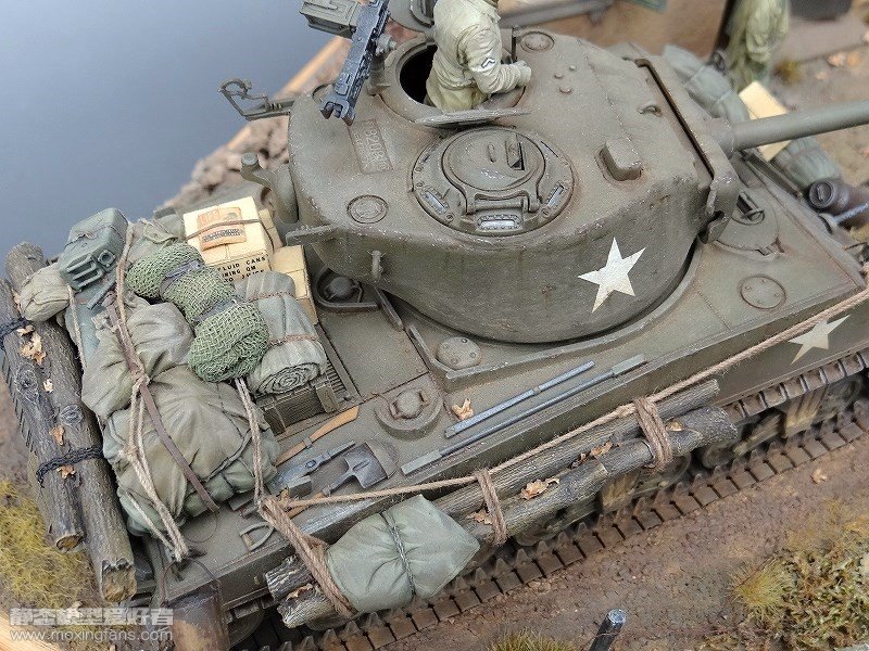 这件场景作品设定的情节很有意思,一辆威利斯在桥头被卡住动弹不得,只好叫来一辆M4将其拖出来,士兵拴好钢缆后向M4的车长示意可以拖了。战车的制作偏向日系手法(Shigehiro Yoshida就是一位日本大师),并无明显的CM技法的痕迹,旧化方面也和欧美风格大相径庭,非常细腻耐看,总体来说给人一种很自然清新的感觉。有时候一种口味看腻了,换一种玩也不错。