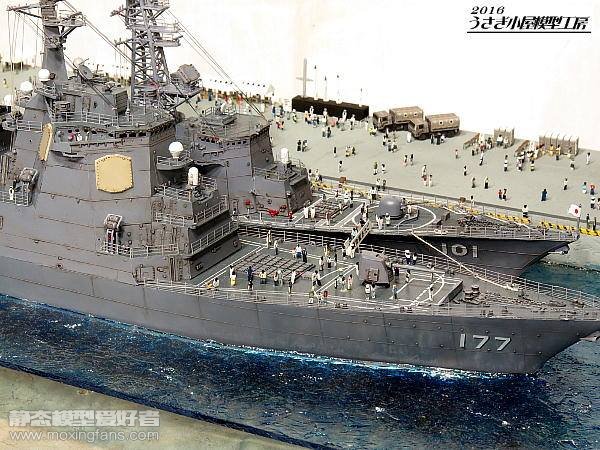 大师的这件场景作品表现的是日本海军自卫队公开日码头的场景,两条驱逐舰分别是爱宕和村雨,使用的是PIT-ROAD的1/350的套件。整个场景非常宏大,表包含舰艇,车辆,多种建筑以及超过600个平民。平民全部是使用的纸质材质的成品,其实也无可厚非,毕竟比例实在太小了。整个场景非常宏大,其中不乏细节看点,绝对的大作。