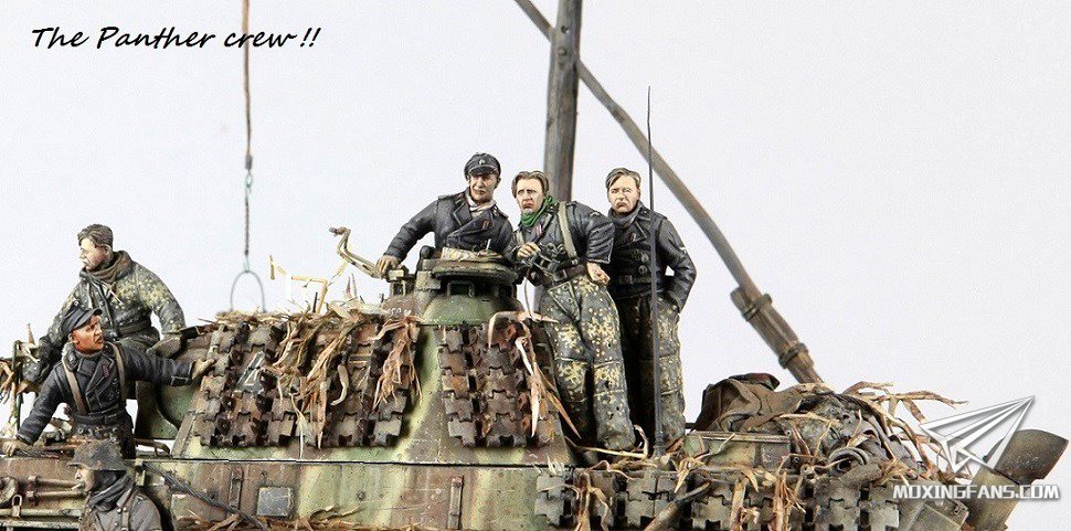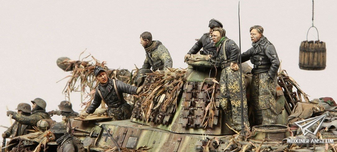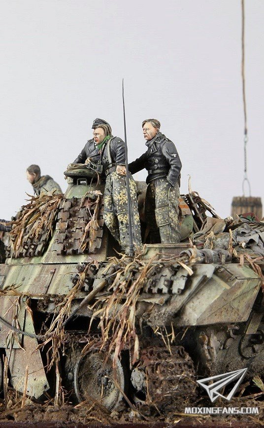 这件作品是 Mirko Bayerl 大师制作的,表现的是1945年3月驻扎在巴拉顿湖和韦伦斯湖附近的德国党卫军希特勒青年团装甲师装备的豹G及掷弹兵在清晨准备发动进攻的场景。按照作者的介绍:这件场景作品表现的是坦克和掷弹兵们正在为黎明即将到来的混战做准备,他们缺乏足够的食物和休息,饥饿、疲惫、寒冷和泥泞的路面使得他们不仅要与苏军作战,还要跟恶劣的环境作战。希望你能够在这件场景作品中感受到寒冷,潮湿和浓雾,在接收到新的命令以后,他们塞到嘴里一片面包,喝一口匈牙利Palinka之后,就消失在浓雾中了。原文: Im Morgengrauen vor dem Angriff - Ungarn , März 1945