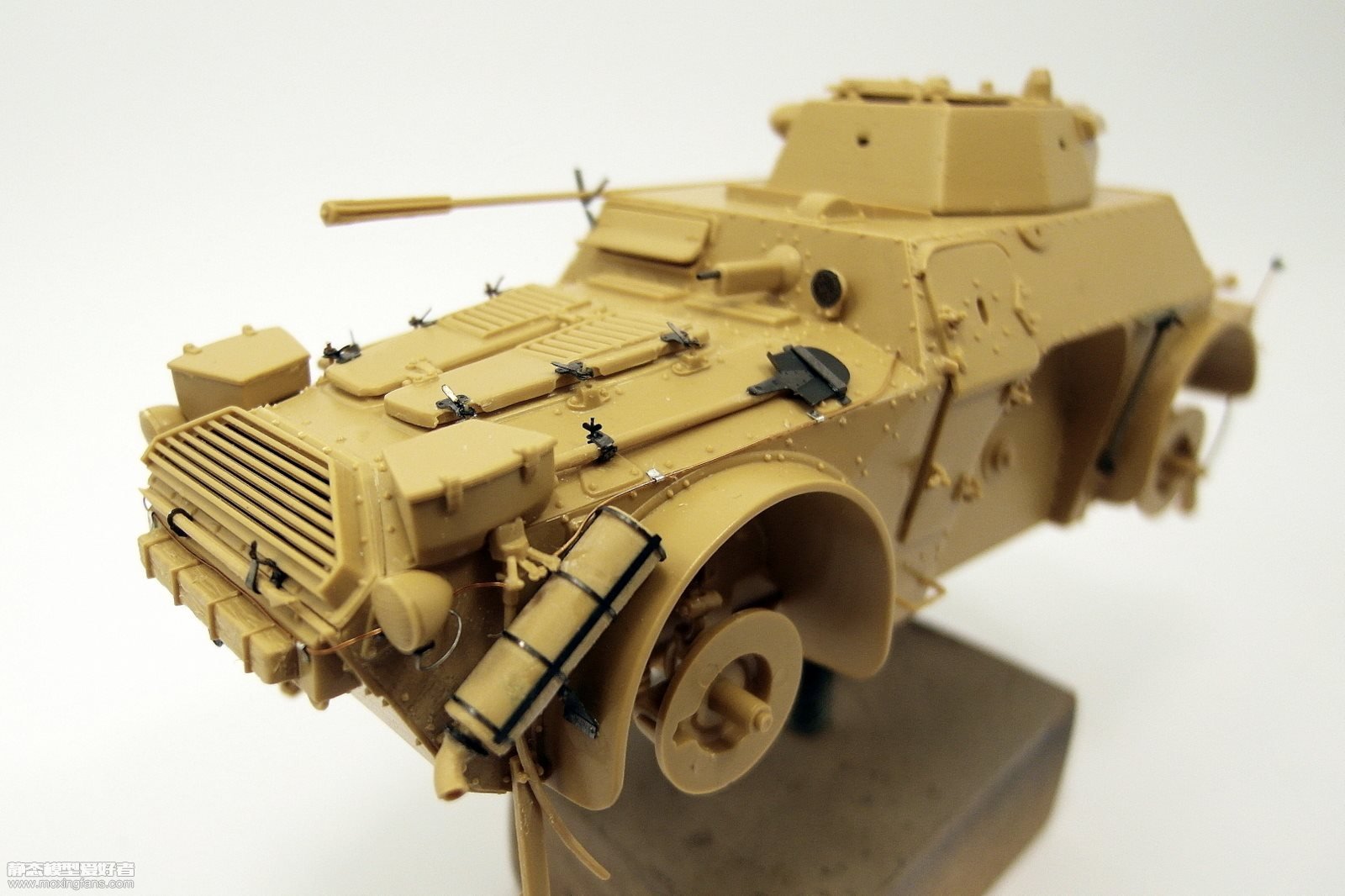 作者的模型介绍中没有提及模型的比例,小编准备发布的时候才查到竟然是72比例的!虽然比例小,但是细节一点也不含糊,小小的模型很有看点。这个题材非常好,小车也很可爱,从素组的照片可以看出作者对这辆小车做了一些改造,加了蚀刻片,换了炮管,改了工具扣,换掉了示宽棒,添加了管线等。意呆利的模型板件一向是以粗糙著名的,水贴的质量却是出奇的好,同好们戏称“买水贴送模型”,作者能将72比例的意呆利做出这种效果,小编也是佩服的五体投地。