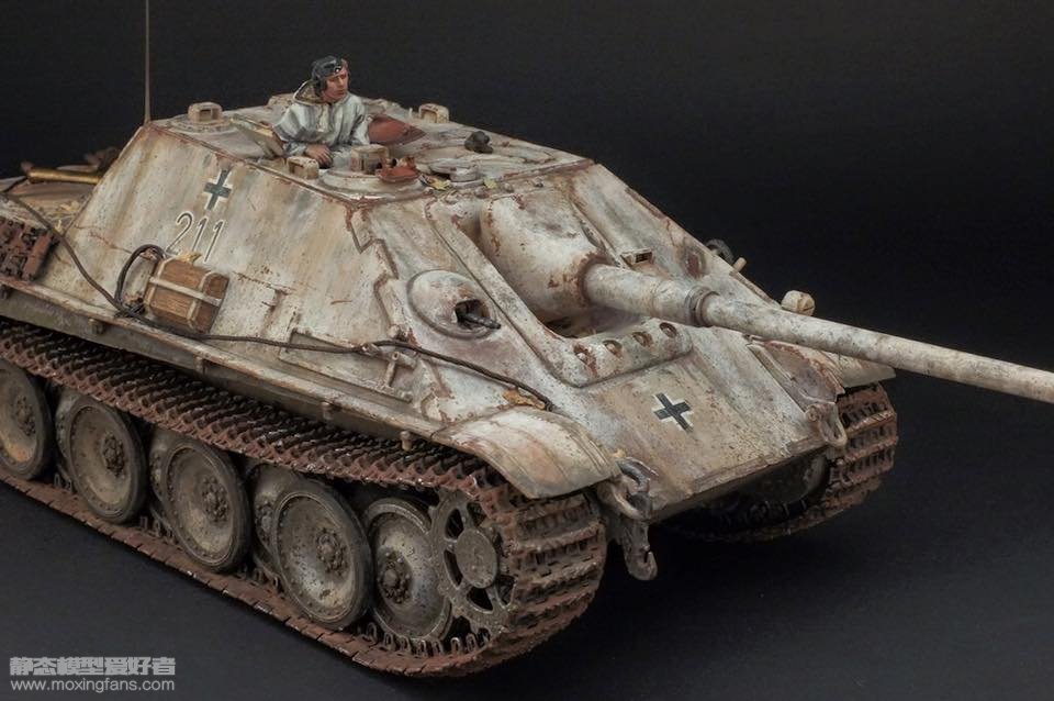 这件作品使用的是威龙6393的板件,涂装方面依旧是雪地迷彩,然而却和那辆虎王的防磁是两种风格。这辆猎豹的防磁明显更加柔和,处理的更加精细,隐隐能看到雪地迷彩下的迷彩色。细节处理的也非常漂亮,完美体现出猎豹的优美线条。