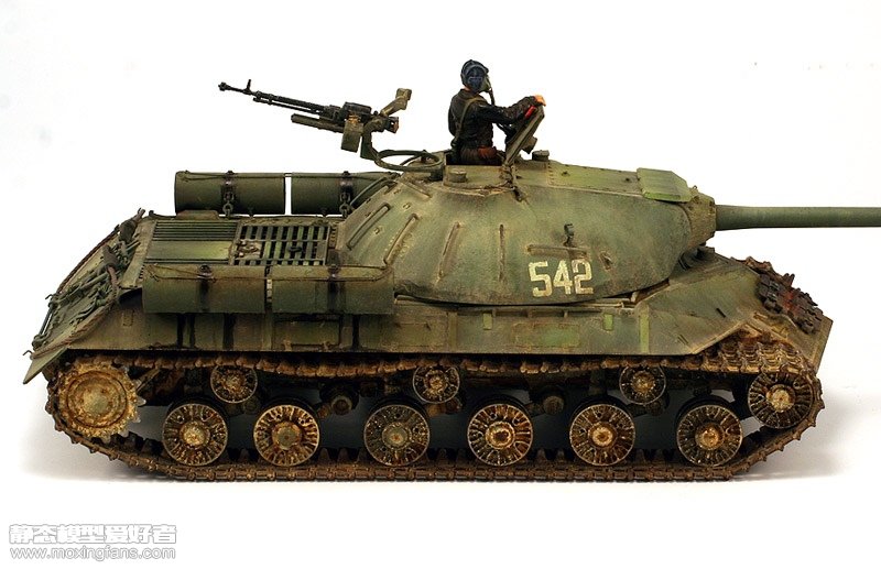 田宫的JS-3是田宫的代表作之一,虽然小号手后来出了一款JS-3M,算是这款的山寨版,但是不管是细节还是组合度都是远远不及的。Grzegorz Zięcina大师的这件JS-3使用的也是田宫的板件,使用蚀刻片将细节进行了加强,履带也换成了金属履带,拆除了前面的两块挡泥板,将毛子战车的那种彪悍气息完整的表现了出来。涂装方面使用了目前流行的CM技法,整车的立体感得到了大大的加强。旧化方面也是功力深厚,渍洗、滤镜和锈迹的手法很老道,天然土使用的也很漂亮,赞!