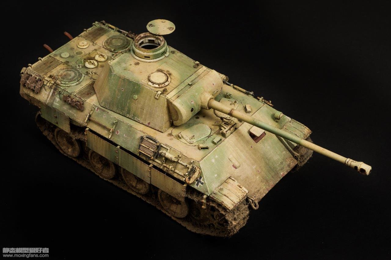 大师的这件作品使用的是威龙的豹D,因为板件有些老,所以使用蚀刻片对细节进行了加强。豹D大部分都是有防磁装甲的,所以大师使用了自带防磁的6428,适当的制作了一些剥落效果(此处感谢109指正)。涂装方面使用了不常见的黄绿色迷彩,看上去也是很和谐的,旧化方面有些小清新,掉漆和流锈很是精彩。小编一直想做一直豹D,终于有目标了。