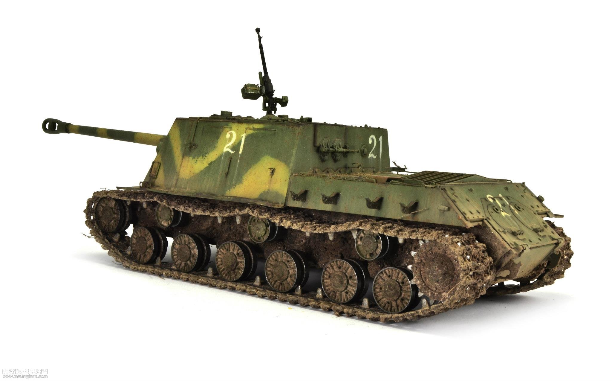大师的这件作品题材选择了SU-122S坦克歼击车,基础套件使用了田宫的套件,又使用金属炮管,金属履带,蚀刻片,部分威龙的零件加自制零件来加强细节。涂装使用了苏军少见的黄绿色迷彩,掉漆非常细腻,后期的雨痕和流锈效果也很赞,底盘的天然土使用的比较粗犷,尽显毛车的凶悍本色。