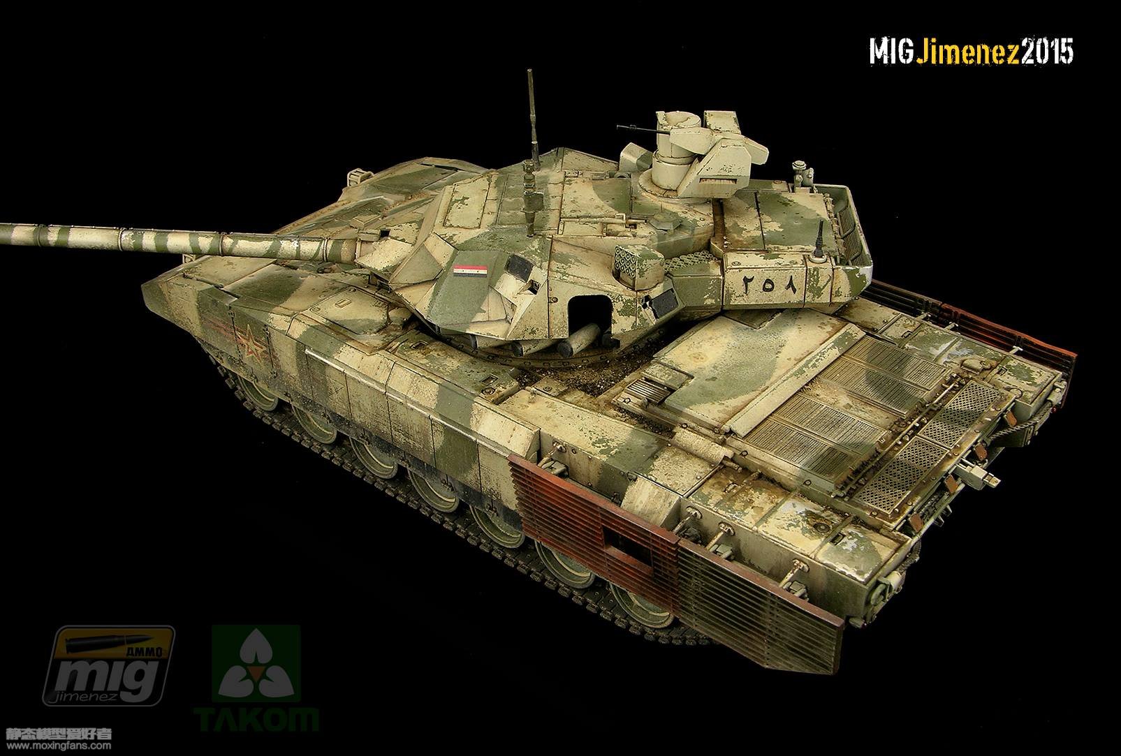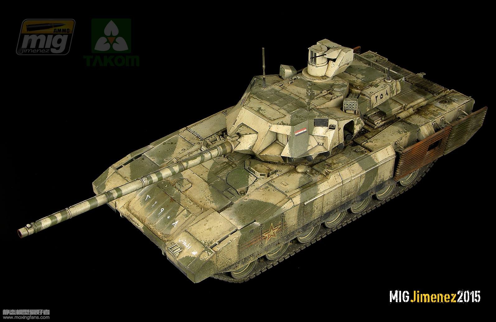 这件T-14作品是米格大师和三花合作之后的另一件作品,以直做为主,涂装采用了苏军黄绿迷彩,并未采用阅兵涂装。既然是实战状态,米格大师下手就重了一点,掉漆比较严重,车体后部的栅栏装甲上了比较重的锈蚀效果,天然土使用的也比较狠,总之就是各种技法各种秀,反正自己的东西不花钱嘛。经过这一番打扮之后,T-14看上去还是挺顺眼的,至于考证吗,还是算了吧。