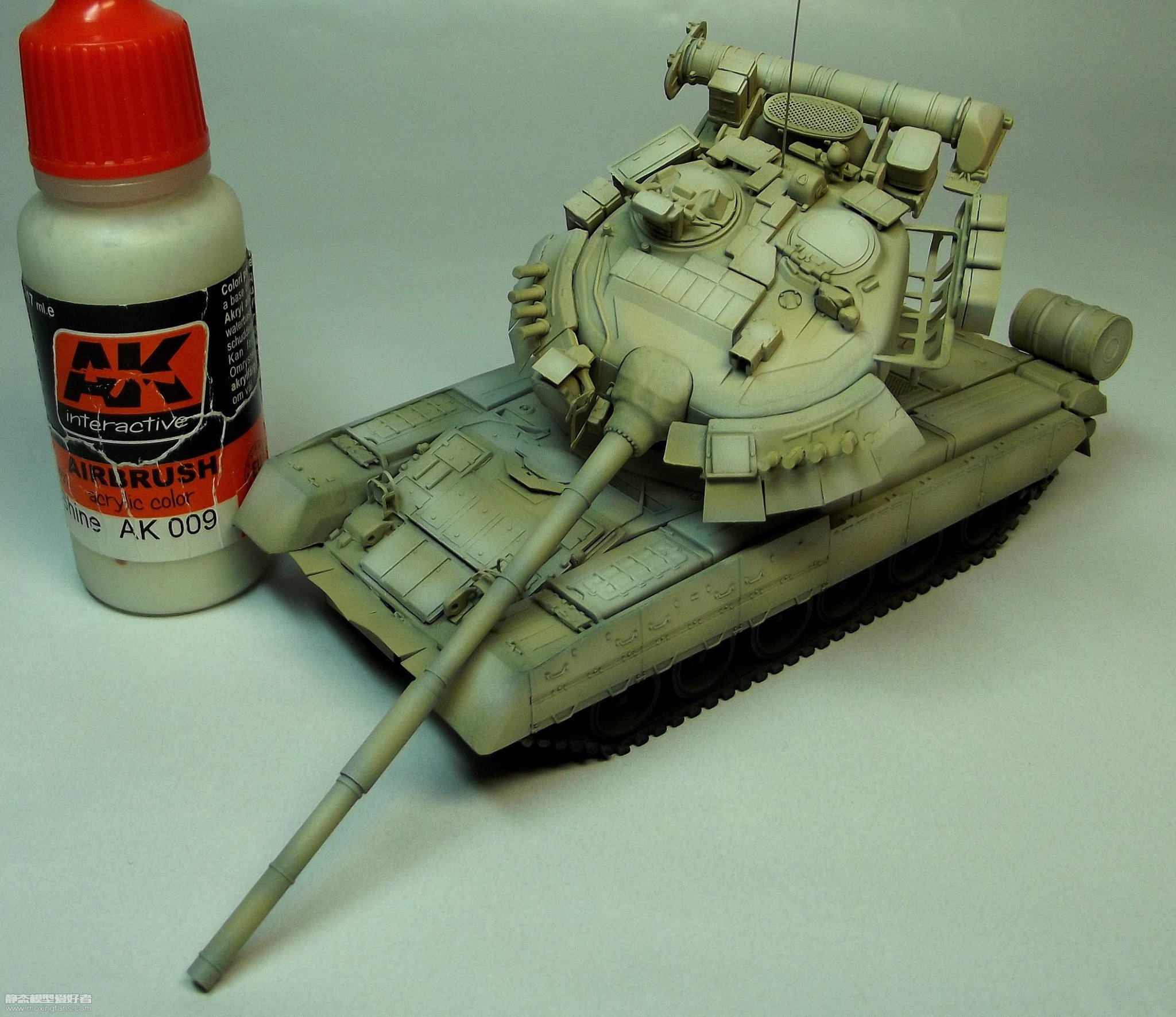 大师的这件作品是1/72比例的T-80U,没有说明套件品牌,难道是搜模阁?从后面的过程来看,使用了金属炮管,蚀刻片等补品,制作的非常精细。涂装采用了苏军三色迷彩,使用水性漆喷涂,后期还搭配了一个小地台,力图再现2006年武器展上面的那辆T-80U的雄姿。