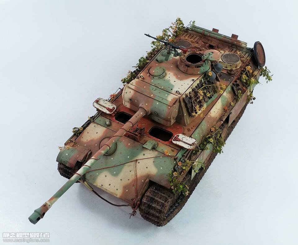 Daryl Dancik大师给这件作品取名“战争之花”,细想来还是有点意思的,这辆豹子使用鲜花挂满了全身,再加上自己的三色迷彩,确实显得五彩斑斓,说战争之花也过得去。豹G使用田宫的套件,在其基础上增加了大量蚀刻片等补品进行改造,履带也换成了金属履带,工具的摆放也进行了改造。涂装选择了对比度很高的三色迷彩,天然土使用的比较大胆,整体来看还是很有特色的。