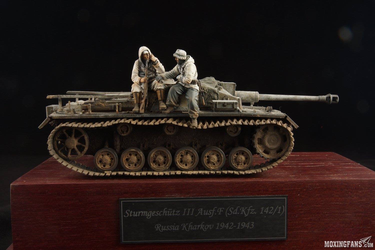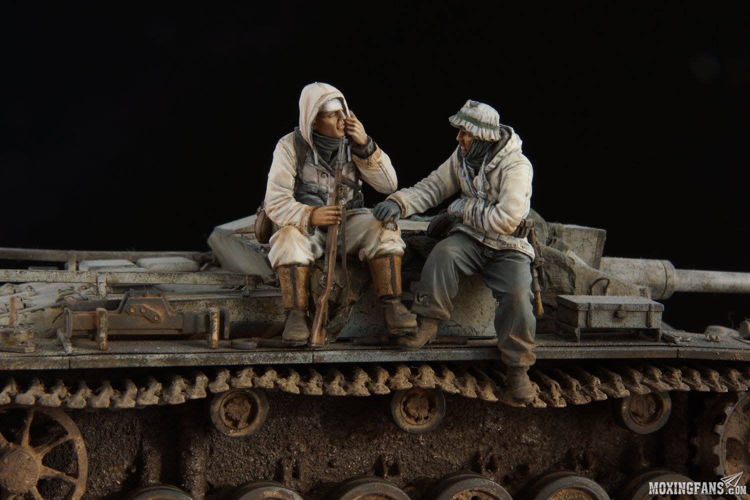 Alexander Bogdanov大师的这件作品是他本人比较满意的,使用的是威龙的三突F型套件,使用了牛魔王(Eduard)的蚀刻片,RB的金属炮管和Friulmodels的金属履带来增强细节。涂装方面则是选择了德国灰为底色,在其上又上了一层斑驳的雪地迷彩,重旧化,使用了大量天然土来修饰行走部分,突出了战车的沉重感。休息姿态的兵人选择了Evolution的产品,和战车搭配很和谐,为作品增色不少。