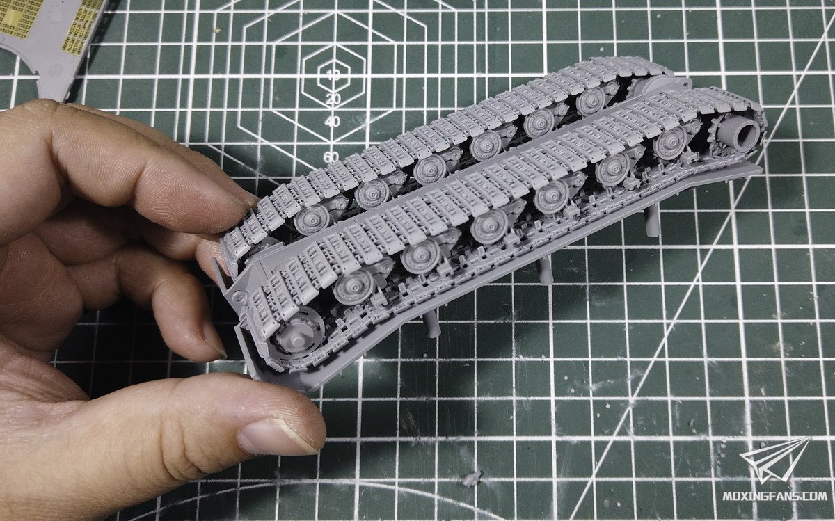 模型组装 我们首先来制作行走装置。这可能是整辆车组装最繁琐的部分,每侧6组行动装置,每组4个轮子,总共48个车轮。难度不大只是重复修剪比较耗时。履带制作相对简单,唯一需要注意的地方是主动轮和惰轮上的小块履带,是设计有方向和角度区别的,大家一定要按照说明书的编号进行组装。虽然区别可能不大明显,但是装错了还是很影响观感效果的。