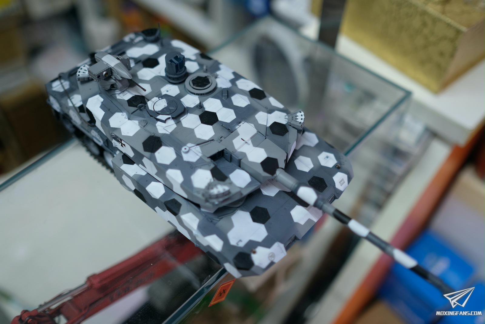 自从看到革命豹展示车后,笔者便对这辆车心仪至深。而tiger模型在2016年先后开发并发售了革命豹I/II型,笔者也有幸购得了一辆I型套件。对此评测在此不过多赘述了,此款模型开模可以算得上优秀的水平。我后来又先后为此车购得了magic model的金属L55炮管,和三信的豹2挂胶履带。 革命豹套件,开模优秀。 在构思制作的时候,因为有同好在之前直做了一辆革命豹I型,他当时选的涂装是防务展的样车涂装,为避免雷同,我选择与他制作不同的涂装;恰巧此时看到了莱茵金属公司出品的130mm滑膛炮展示样车,其涂装采用海灰做底,上边覆盖黑/白色的正六边形色块,充满了未来感。我瞬间意识到如果把这个涂装移到革命豹这种非常“方”的车上,会同样好看,随即围绕着这个涂装方案展开制作。 制作过程中修改了单色底色灰的样式,采用两样灰(深/潜)以棋盘式分布,模拟现代城市全玻璃外立面建筑的感觉,而后使用遮盖纸和裁切模板裁出边长为7mm的六边形进行遮盖喷涂。虽然如此施工,工作量巨大,但却有着可以随时调整六边形分 布和调整黑白块明暗度的好处,事实上也是如此,随着车体和炮塔的迷彩逐步成型,涂装使人眼前一亮,内心的喜悦感油然而生。