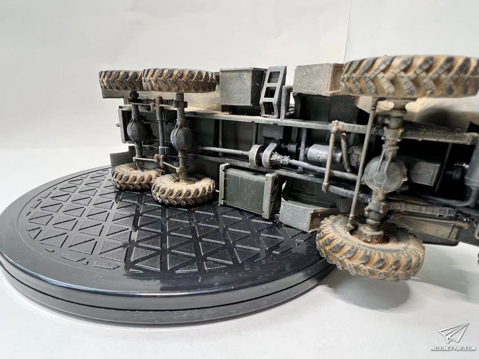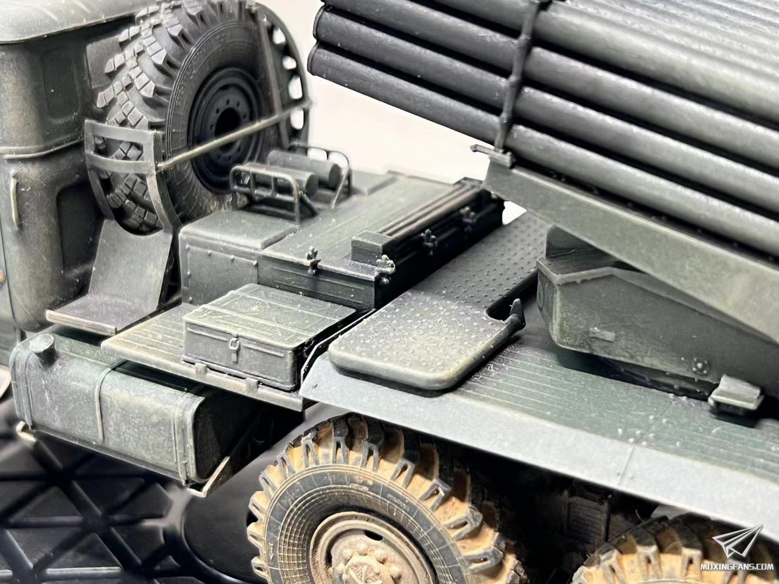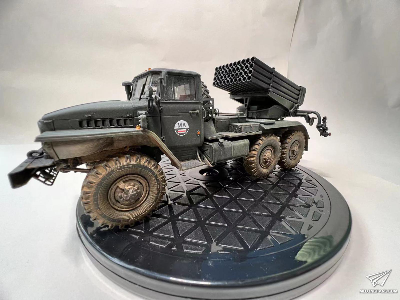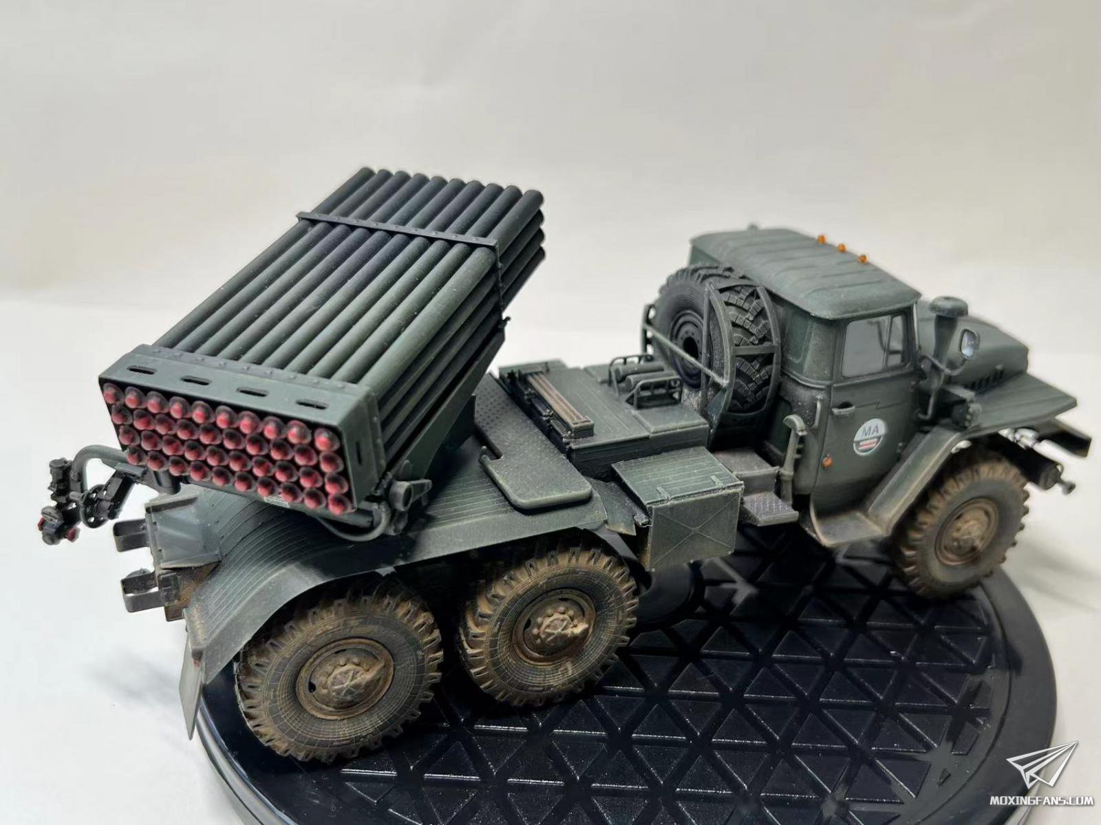小号手01028 1/35 俄罗斯BM-21“冰雹”122毫米多管火箭炮,全身深绿,简单旧化,配了泉微旧化土,加了火箭弹发射管管线和探照灯管线,组合度比hobbyboss的喀秋莎好很多,细节一般,橡胶轮胎很硬,建议用树脂轮胎替代