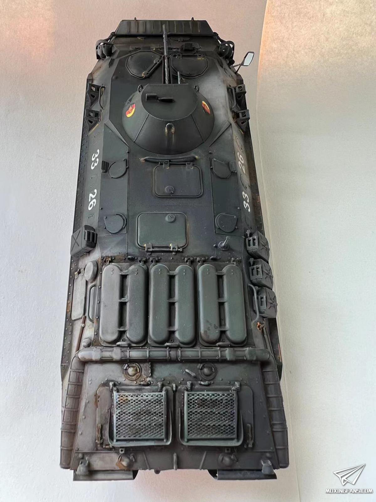 小号手出品的前东德步兵战车,组合度尚可。用西班牙AV东德三色迷彩涂装,再用油画颜料和AK效果液,欧洲森林土旧化。这个就是前苏联BTR-70,但是东德版本有后视镜,可惜制作时候左边断裂并不知所踪,所以只能做成损坏状态,加了锈蚀效果